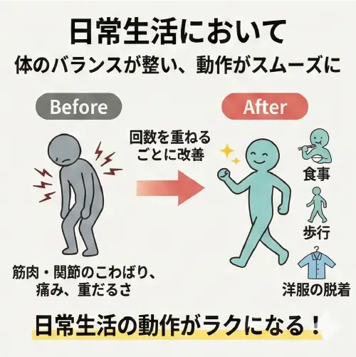個人差はありますが、多くの方が数週間~1ヶ月で「痛みの緩和」や「体の軽さ」を実感されます。